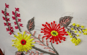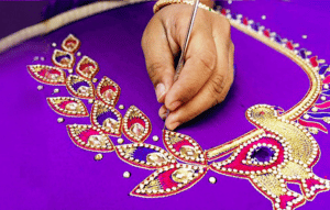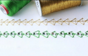 Embroidery is the craft of decorating fabric or other materials using a needle to apply thread. Embroidery may also incorporate other materials such as pearls, beads, quills, and sequins. In modern days, embroidery is usually seen on caps, hats, coats, overlays, blankets, dress shirts, denim, dresses, stockings, and golf shirts. Embroidery is available in a wide variety of thread or yarn colour.